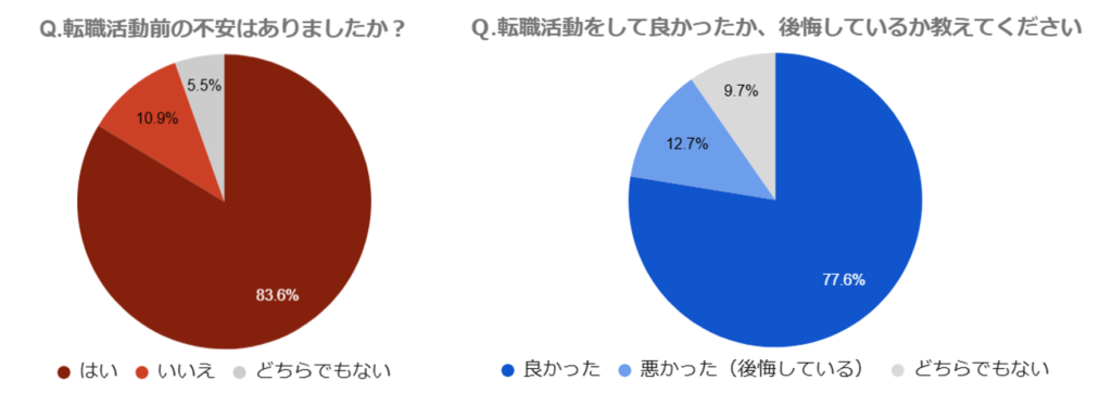 転職活動前は不安を抱えていた方が74%以上いる中で、実際に転職活動をして良かったと考えている方も66%おり、後悔している方は12%のみで、案ずるより産むがやすしの結果となりました。