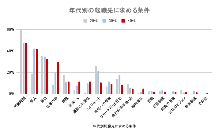 40代のワーママが、転職先で重要視した条件のトップ5は「労働時間」「収入」「休日」「仕事内容」職種」でした。20代~30代と大きく異なるのは、「リモート勤務」を重視する人が少なく「仕事内容」を重視する人が多くなる点です。