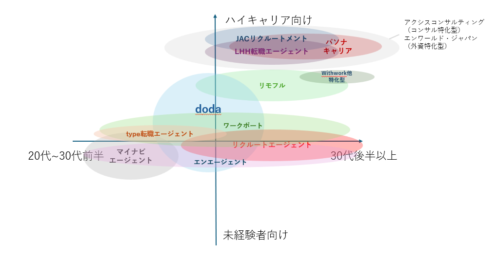 ここまででワーママたちの転職エージェントの利用傾向を紹介しましたが、実際に転職活動をする際には、自分の年齢・キャリアの方向性にあった転職エージェントを選ぶことが転職成功のキーになります。 ランキングに登場した主な転職サイトのターゲット分布は以下のようになります。