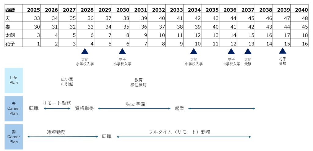 こうした情報を整理してパートナーと話す上で、以下のように親の年齢、子の年齢、ライフプラン、キャリアプランを書き出すこともお勧めできます。内容はざっくりで、決まっていない部分は空白でも、話し合いが大分しやすくなります。