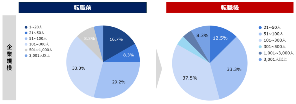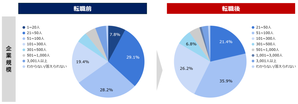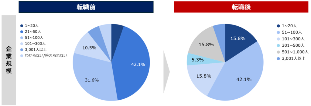 また、人手に余裕があり働き方の融通が利く中規模以上の企業に転職する方が多くなります。51~300人規模の会社に転職する方が多いのは、積極採用をする成長ベンチャーの求人が増えていることが一つの要因と考えられます。
