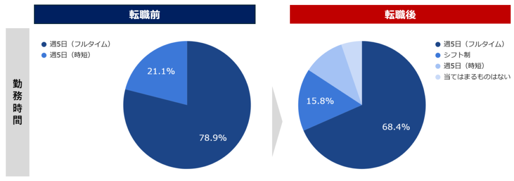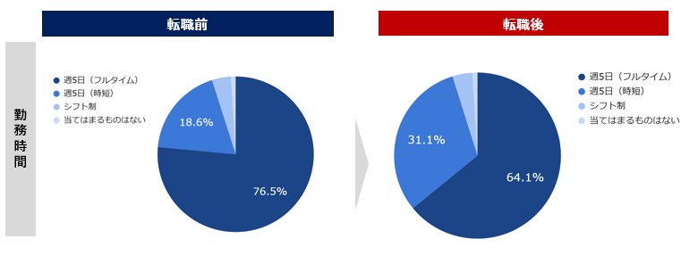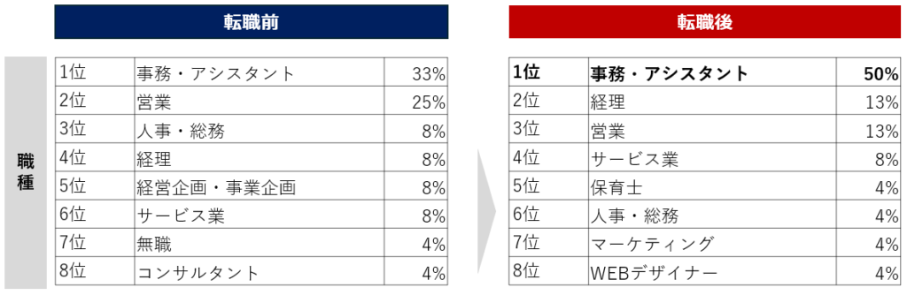 職種の変化で見ると、総合職からバックオフィスに変更するケースが最多で、特に人数の多い営業職に就く女性の半数が内勤の仕事に転職しています。多くのワーママが事務・アシスタント職に転換していることからも、ハードで予測不可能な仕事を避け、決まった時間で安定して働くことを重視している方が多いことがわかりました。