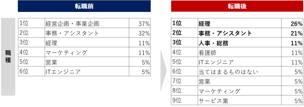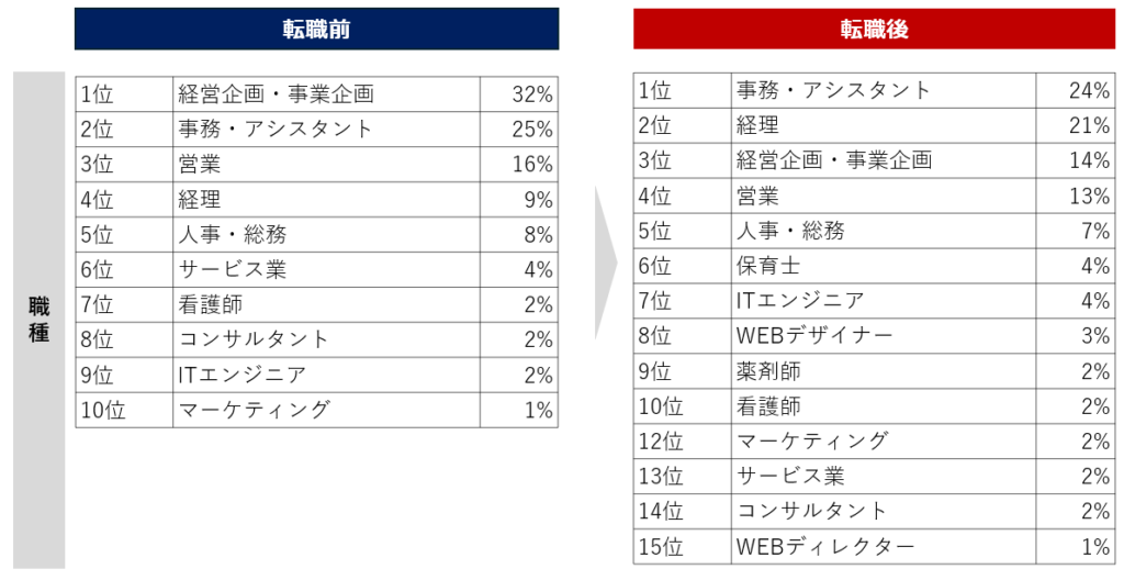 子供が小3のタイミングで転職するママたちは、アシスタント職から総合職への転換、特に「経理」「人事・総務」への職種転換が目立ちます。