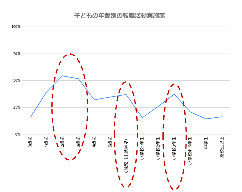 4,400人の子供がいる女性に、インターネット上で調査を行った結果、転職活動を行ったママの年齢分布は以下の通りでした。子持ちのワーママの転職時期には3つのピークがあり、 1回目は「2歳~3歳」の時、次が「小学校入学直前(5-6歳)」その次が「小学校3年生」となりました。