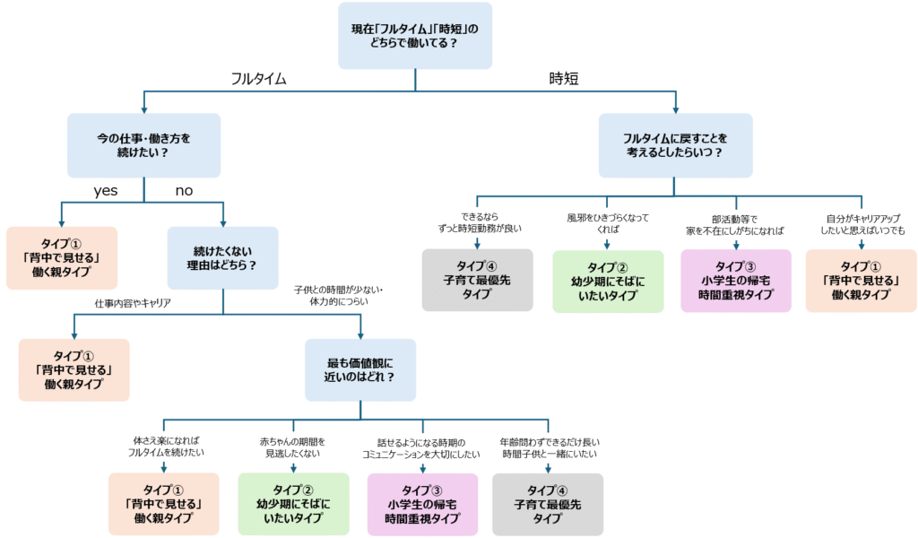 どのタイプが一番しっくりきたでしょうか。 これはあくまでご自身の中の優先順位を確認する作業であり、結果に良い悪いはありません。 子育てに何よりも重要なのは「お母さんの心の安定」です。 自分の価値観や本音に蓋をしてばかりでは、お母さん自身の心がずっと安定しません。まずは自分がどうしたいかを知り、最もいいやり方でその状態を実現する方法を考えていきましょう。手段はいくらでもあるものです。