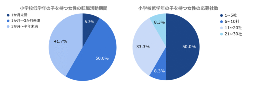小学校低学年の子をもつ社員のワーキングマザーで、転職に成功した人がどれくらいの転職活動を行ったのか調査した結果、転職活動期間は「1か月~3か月」が最も多く(50.0%)、次いで「3か月~半年」(41.7%)と、比較的長期にわたる傾向があります。応募社数は「6~10社」が50.0%で最も多く、次に「11~20社」(33.3%)、さらに「20社以上」応募する人も8.3%います。期間をかけて条件に合う会社に出会えるまで転職活動を続ける人が多いことがうかがえます。